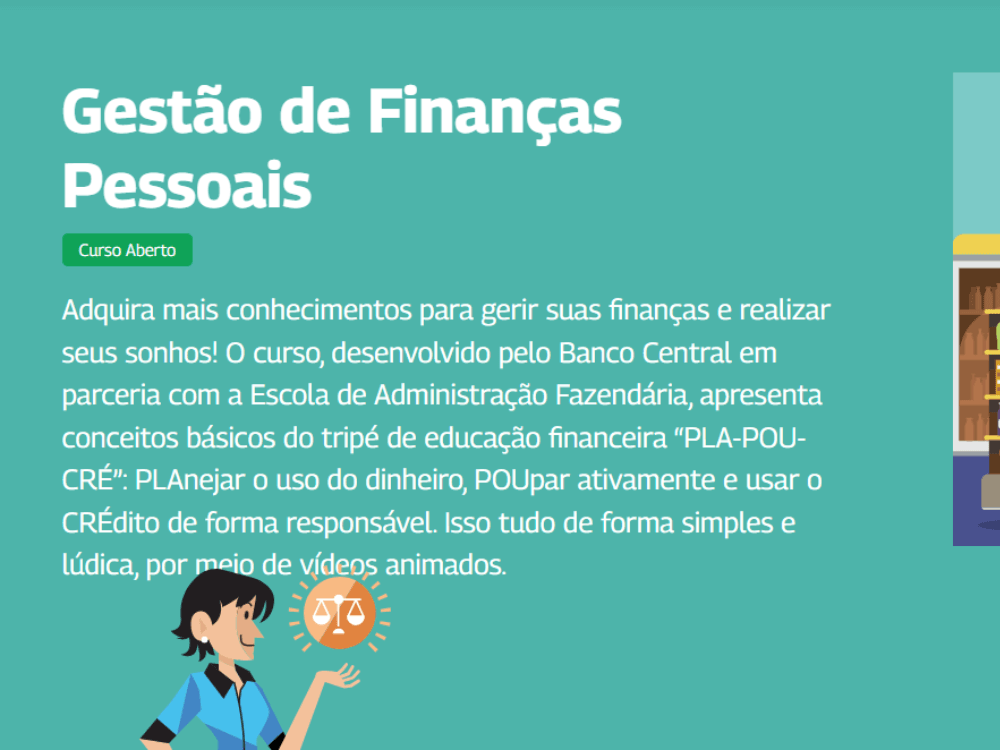 Boa opção para quem quer aprender a gerir suas finanças e realizar seus sonhos! O curso, desenvolvido pelo Banco Central em parceria com a Escola de Administração Fazendária, apresenta conceitos básicos do tripé de educação financeira. ➡️ ACESSE AGORA